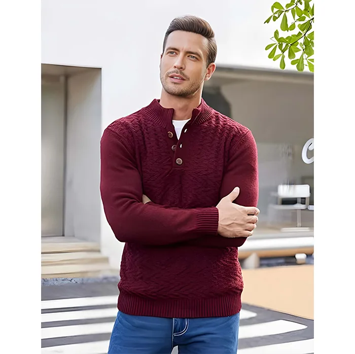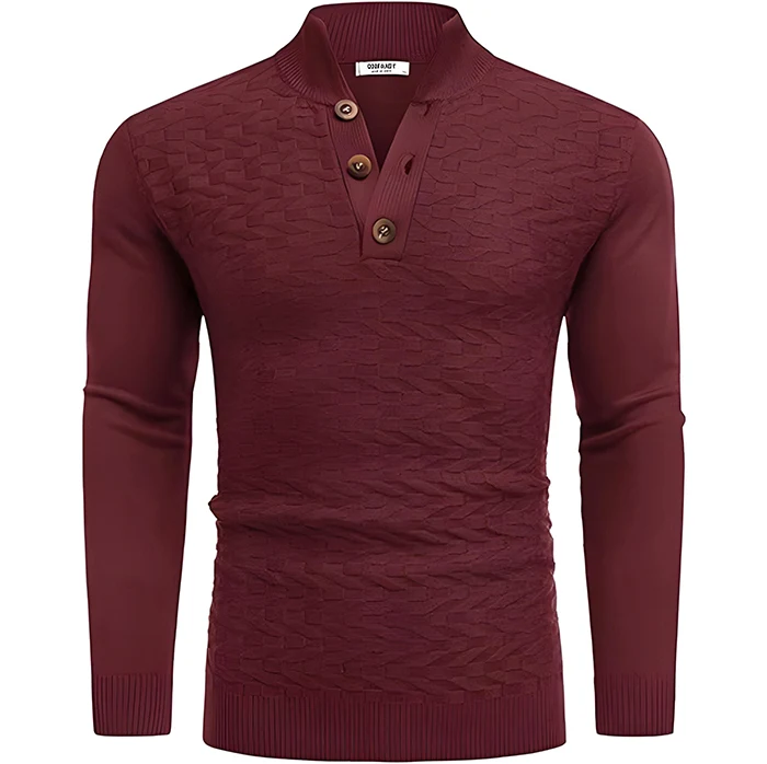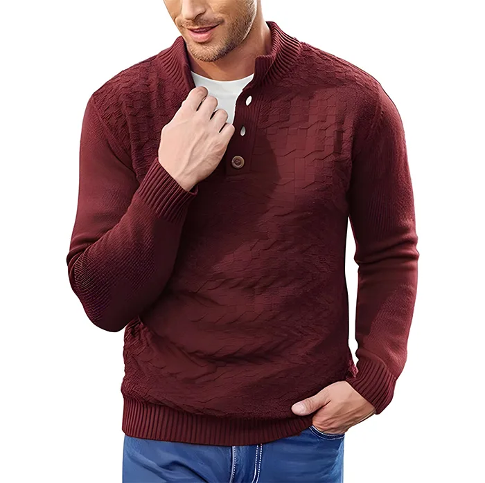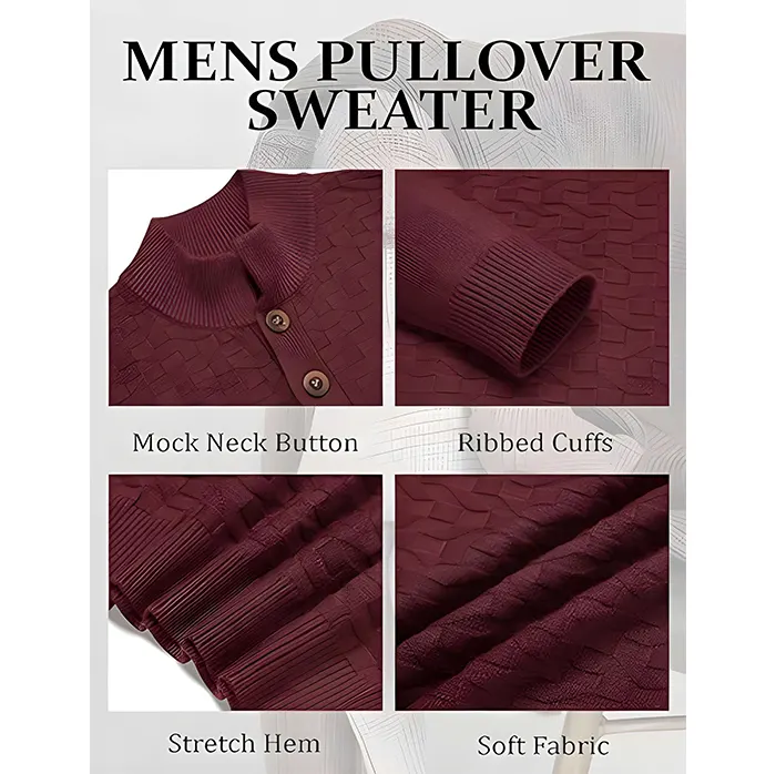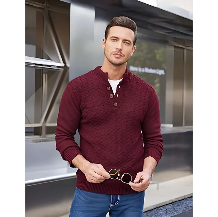 - STYLISH HENLEY DESIGN: The men’s knitted sweater features a regular fit with a button-front Henley neckline, mock neck stand collar, ribbed cuffs, and hem. The textured front panel adds a modern and fashionable touch to this casual sweater for men.