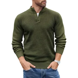 Crafted from soft waffle knit fabric, this lightweight pullover delivers comfort, warmth, and a refined casual style. The mock neck with button closure and ribbed detailing adds a modern touch, making this Men’s Quarter Button Sweater perfect for daily wear, office outfits, or easy layering in cooler seasons.